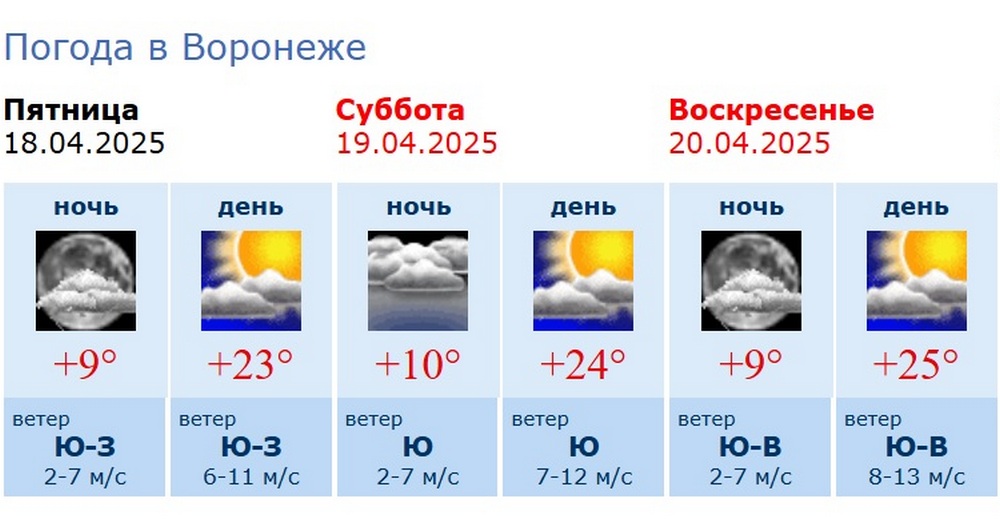 Около +8...+10 градусов прогнозируют в Воронеже ночью в воскресенье, 20 апреля. Последний день пасхальной недели будет в столице Черноземья самым теплым: по информации метеорологов, воздух в городе прогреется до +24...+26 градусов. Осадков по-прежнему не ожидается.