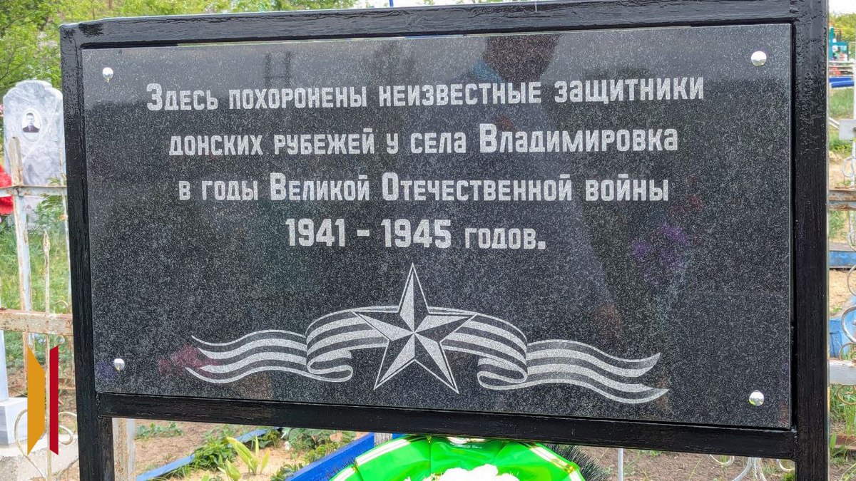 Памятную доску с надписью «Здесь похоронены неизвестные защитники донских рубежей у села Владимировка в годы Великой Отечественной войны 1941−1945 годов» установили на захоронении, которое находится на территории сельского кладбища. На эти цели местное сельхозпредприятие выделило 40 тыс. рублей.