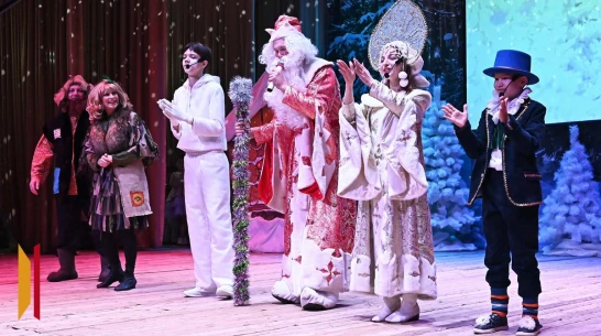 В конце театрализованного представления ребят из зрительного зала пригласили на сцену и устроили для них новогодние игры с участием Деда Мороза, Снегурочки, сказочных героев.