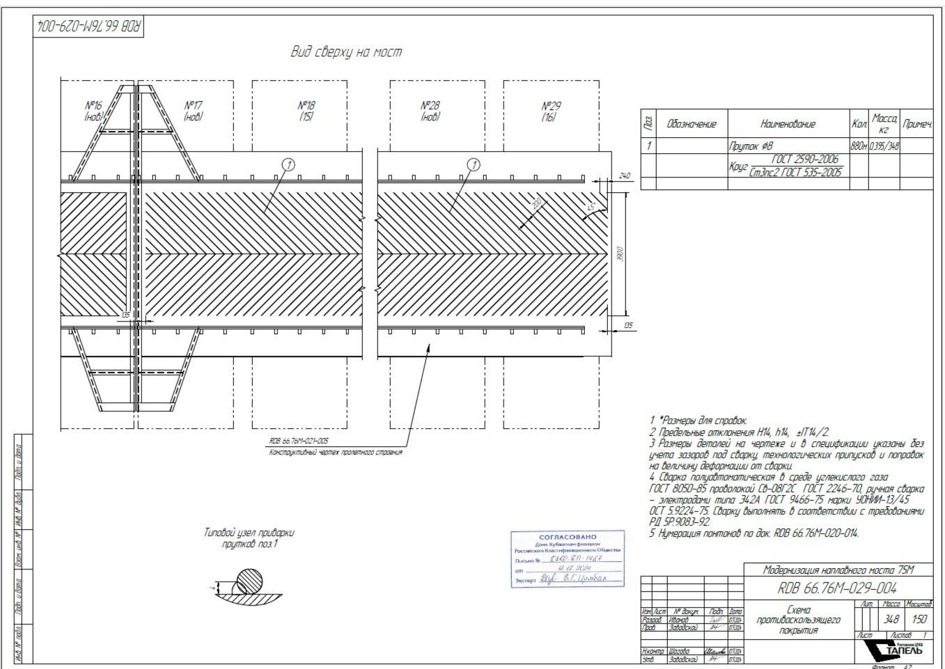 Мост представляет собой секционно-разборное сооружение понтонного типа, состоящее из отдельных звеньев, соединенных шарнирными замками с отводной секцией. Каждое звено состоит из отдельных плавучих понтонов. Через разводные пролеты моста могут проходить суда. Кроме того, на мосту организовано реверсивное движение легкового, пассажирского и грузового транспорта. Допускаемая масса моста – 32 т. По обеим сторонам моста расположены пешеходные зоны. Срок гарантии на работы составит 60 месяцев с момента подписания без замечаний акта приемки законченного объекта. Подрядчик в период гарантийного срока перед каждым навигационным периодом обязан проводить обследование наплавного моста и предоставлять заключение о его состоянии.